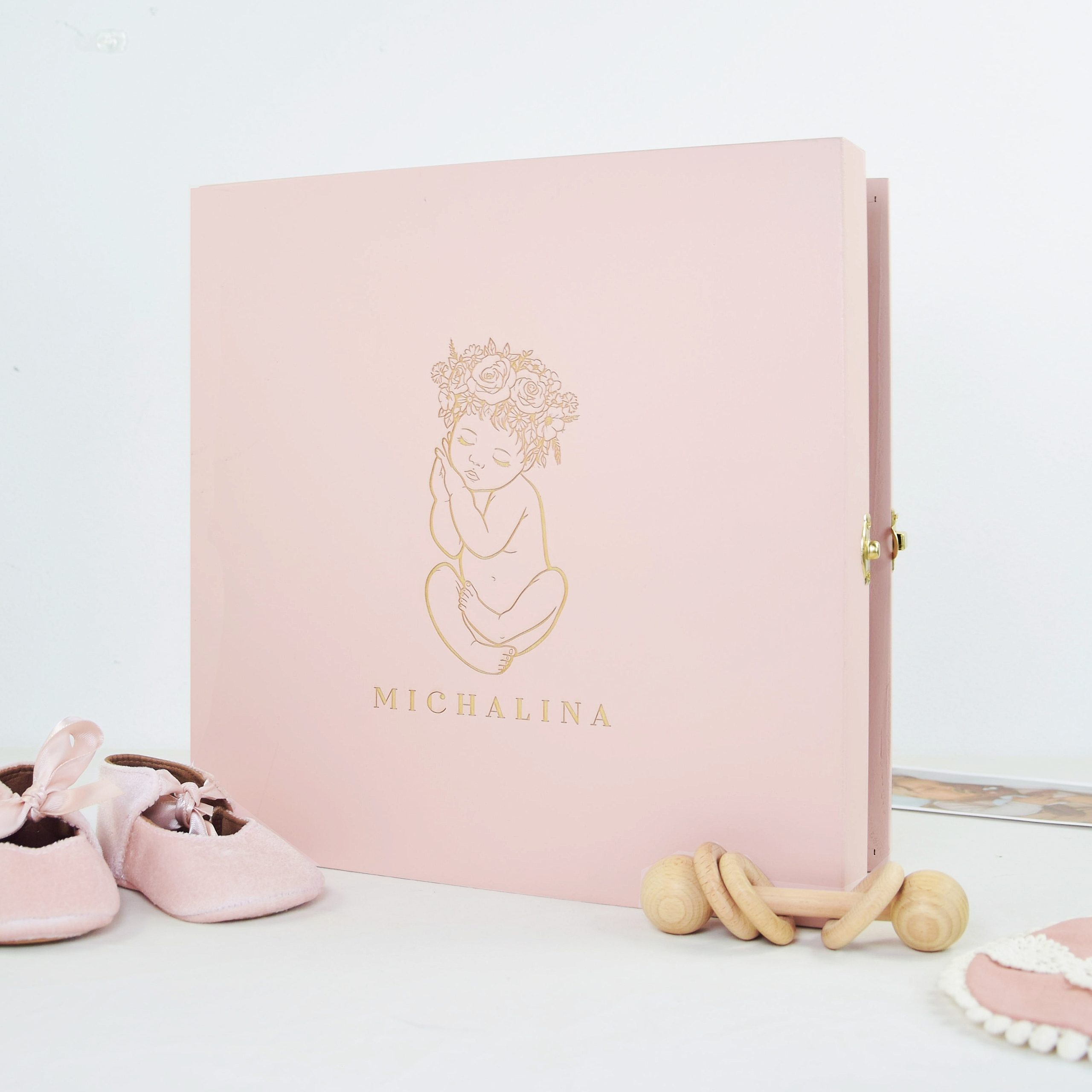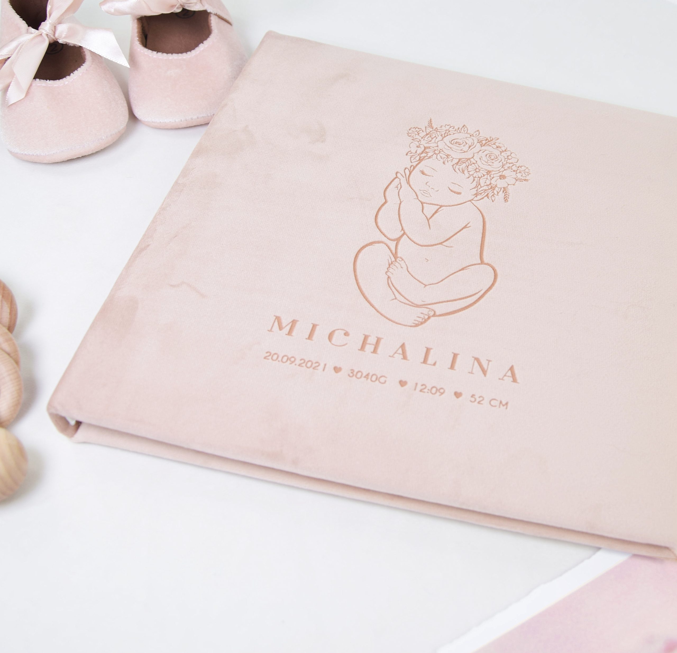 Welurowa struktura albumu w kolorze łososiowym otula wspomnienia miękkością i elegancją, a drewniane opakowanie w pudrowym różu nadaje im formę prezentu, który można wręczyć z dumą i wzruszeniem.To nie tylko album – to skrzynia emocji, wspomnień i miłości, która z biegiem lat nabiera jeszcze większej wartości. Dzięki personalizowanemu grawerowi i możliwości dodania grafiki dziecka, każdy egzemplarz jest wyjątkowy.