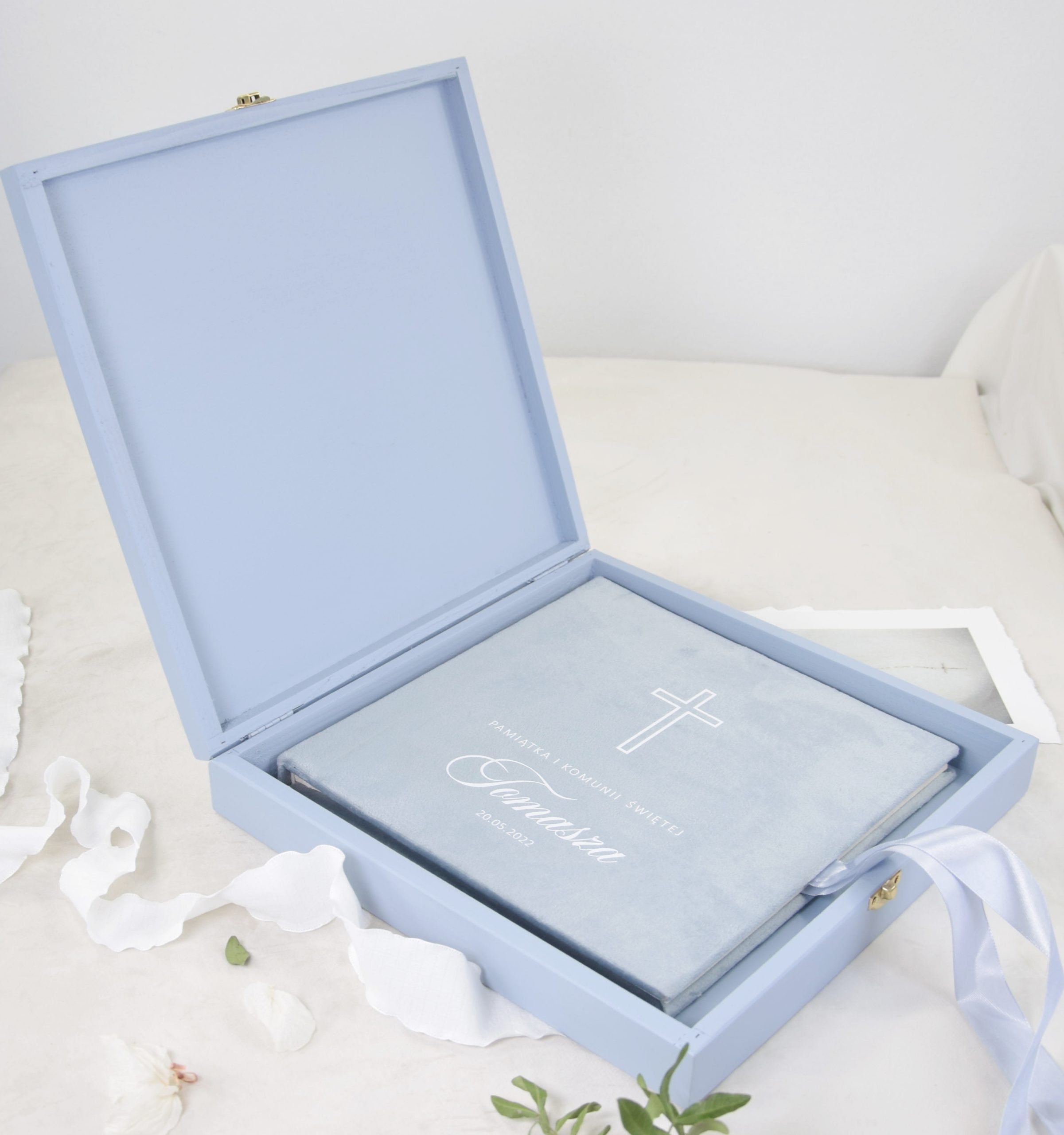 To nie jest zwykłe pudełko. To przemyślana forma przechowywania, która podnosi rangę całego albumu na zdjęcia. Kolor Dusty Blue – subtelny, elegancki, ponadczasowy – doskonale wpisuje się w estetykę uroczystości takich jak ślub czy Pierwsza Komunia Święta.