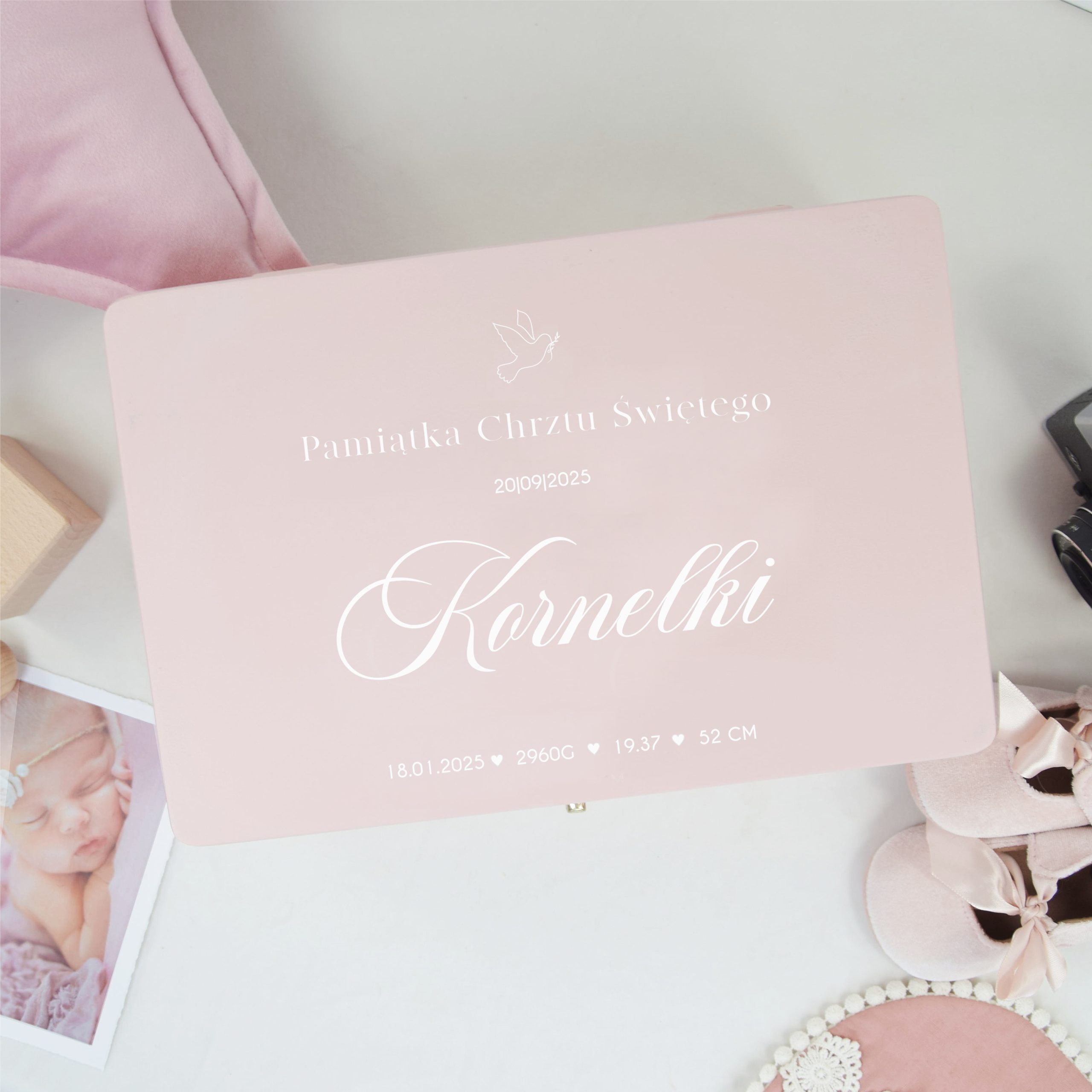 Jeśli szukasz prezentu, który zostaje z rodziną na lata, pudełko wspomnień na chrzest będzie bardzo trafnym wyborem. „Pudrowy Dotyk” to elegancka pamiątka Chrztu Świętego z personalizacją imienia i daty. Dzięki temu wspomnienia nie lądują w szufladzie. Mają jedno stałe i bezpieczne miejsce.
