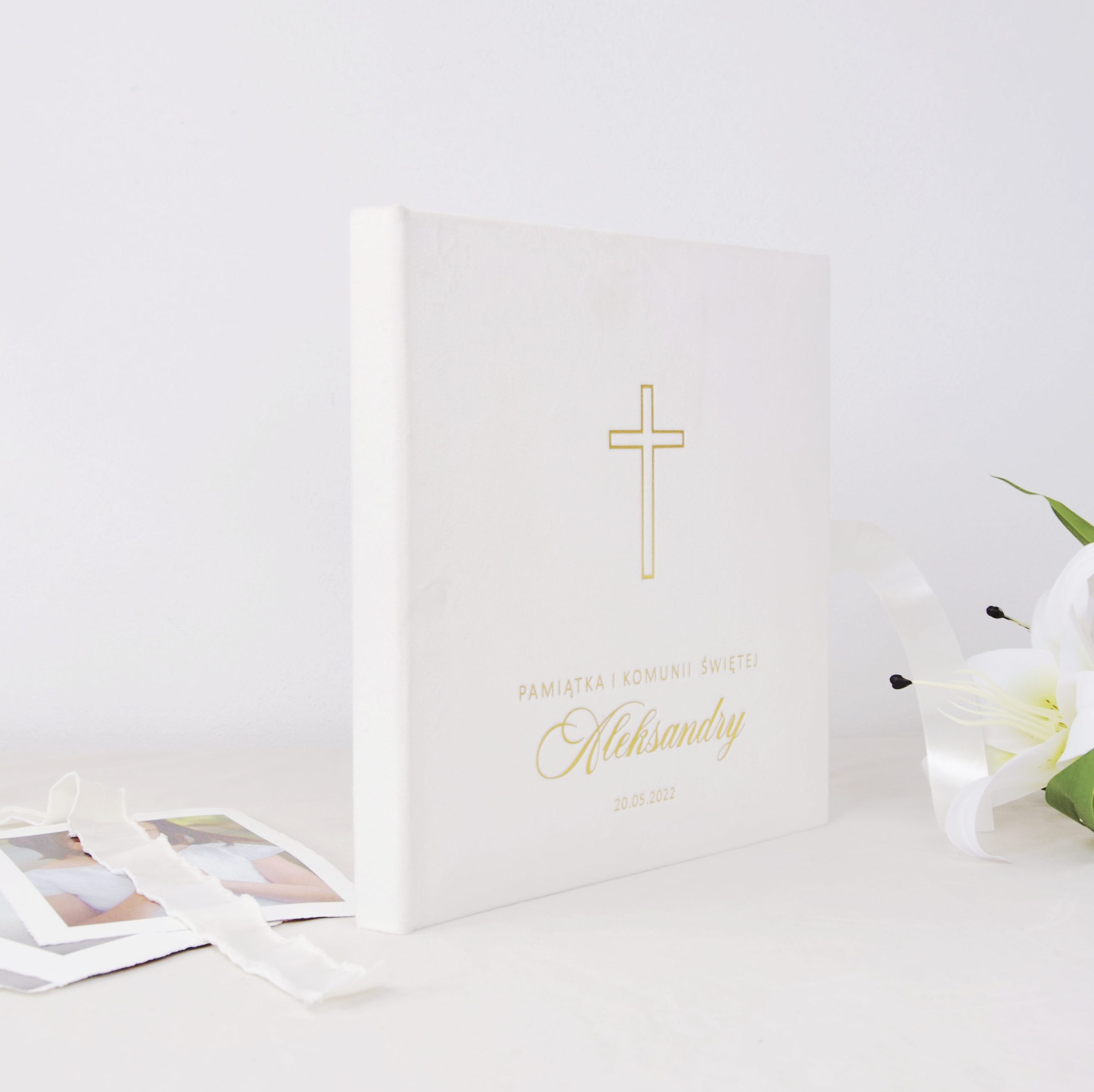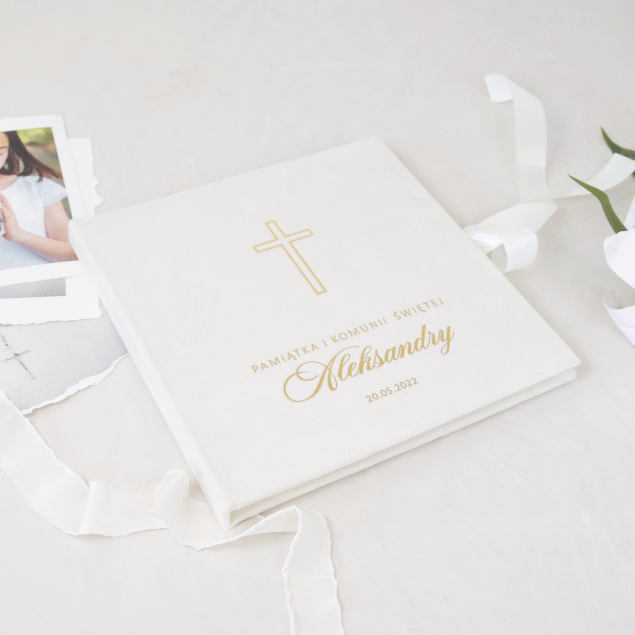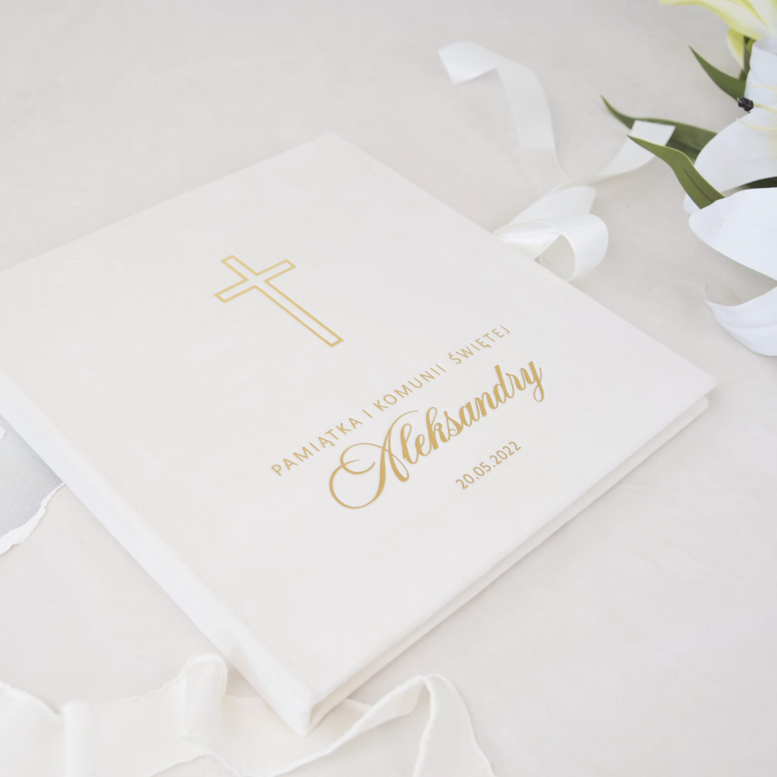Ekskluzywny album welurowy w kolorze złamanej bieli – idealna pamiątka Pierwszej Komunii Świętej