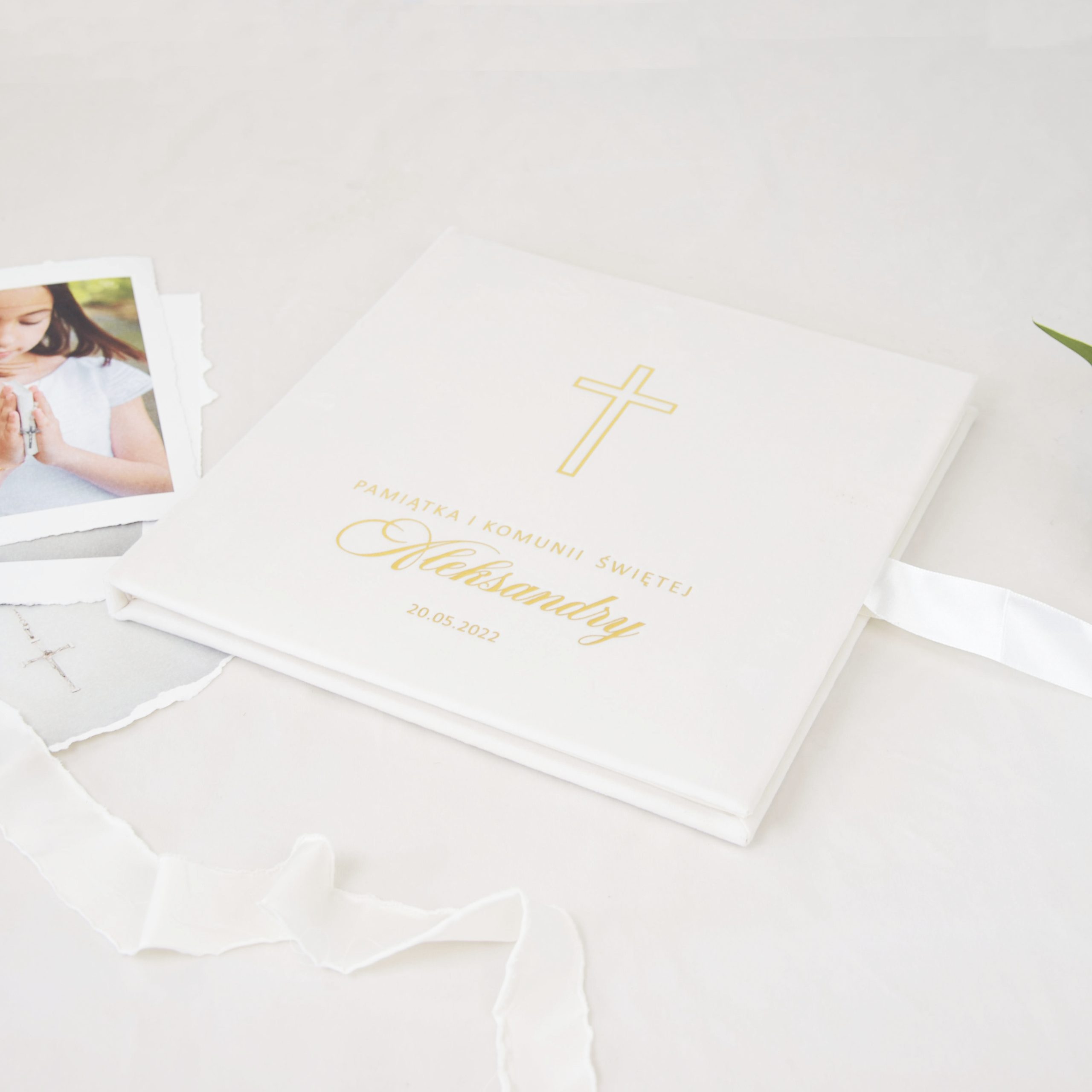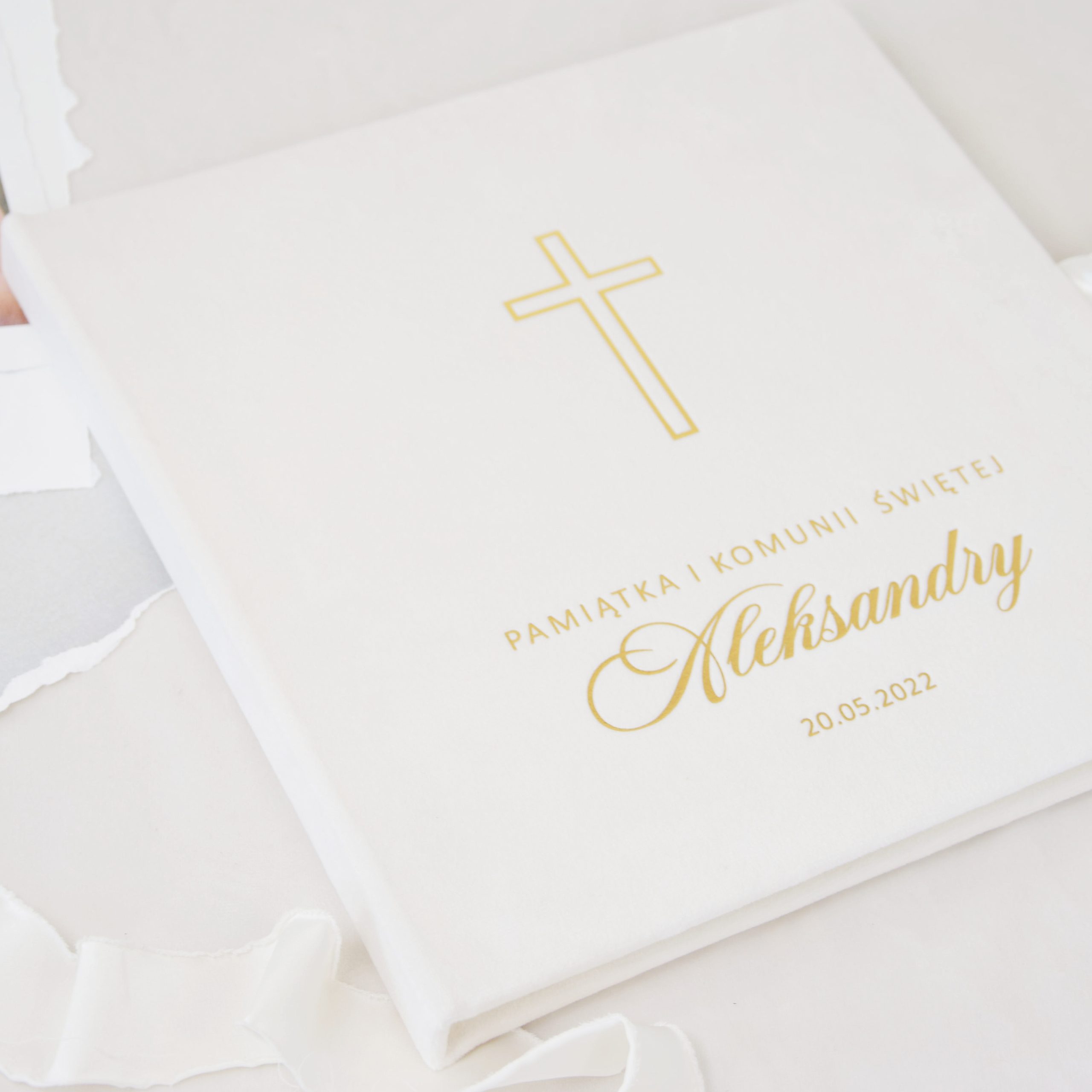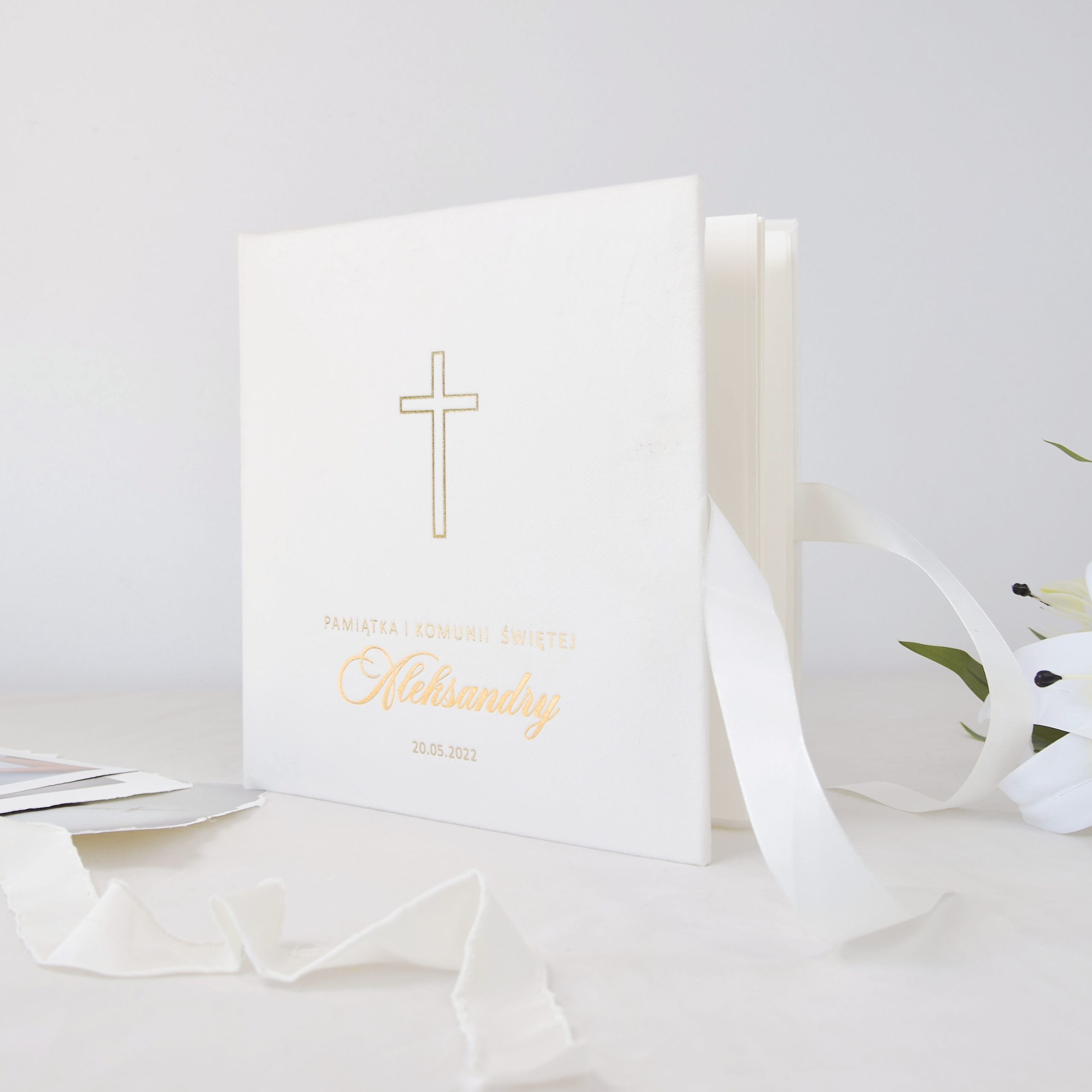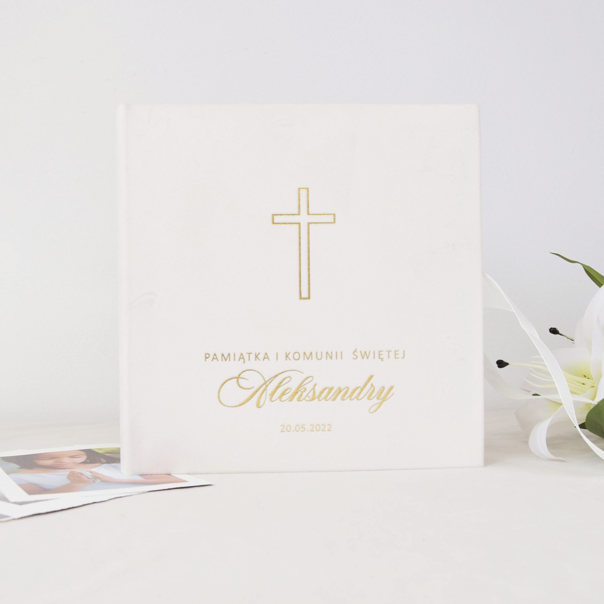 Ekskluzywny album welurowy w kolorze złamanej bieli – idealna pamiątka Pierwszej Komunii Świętej
