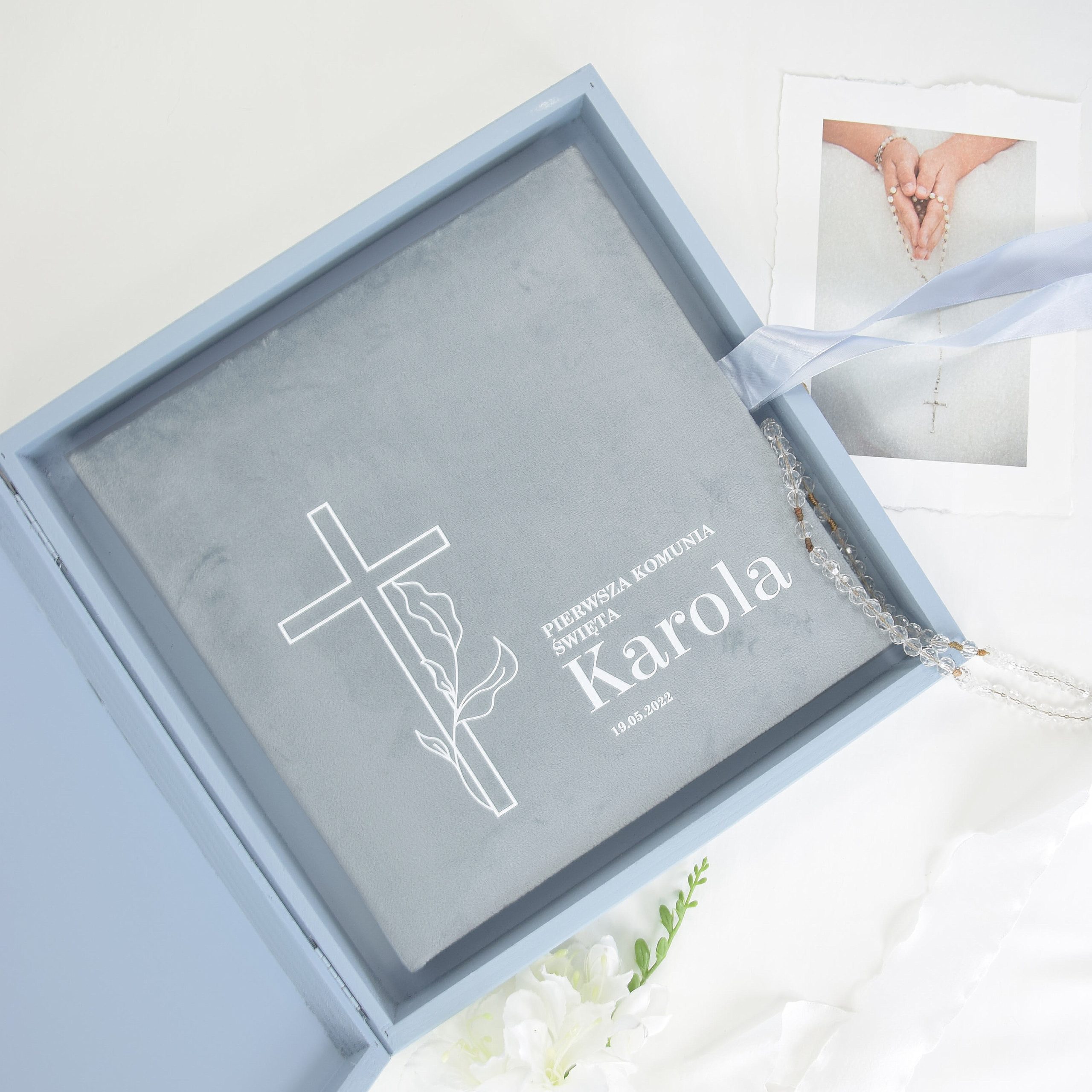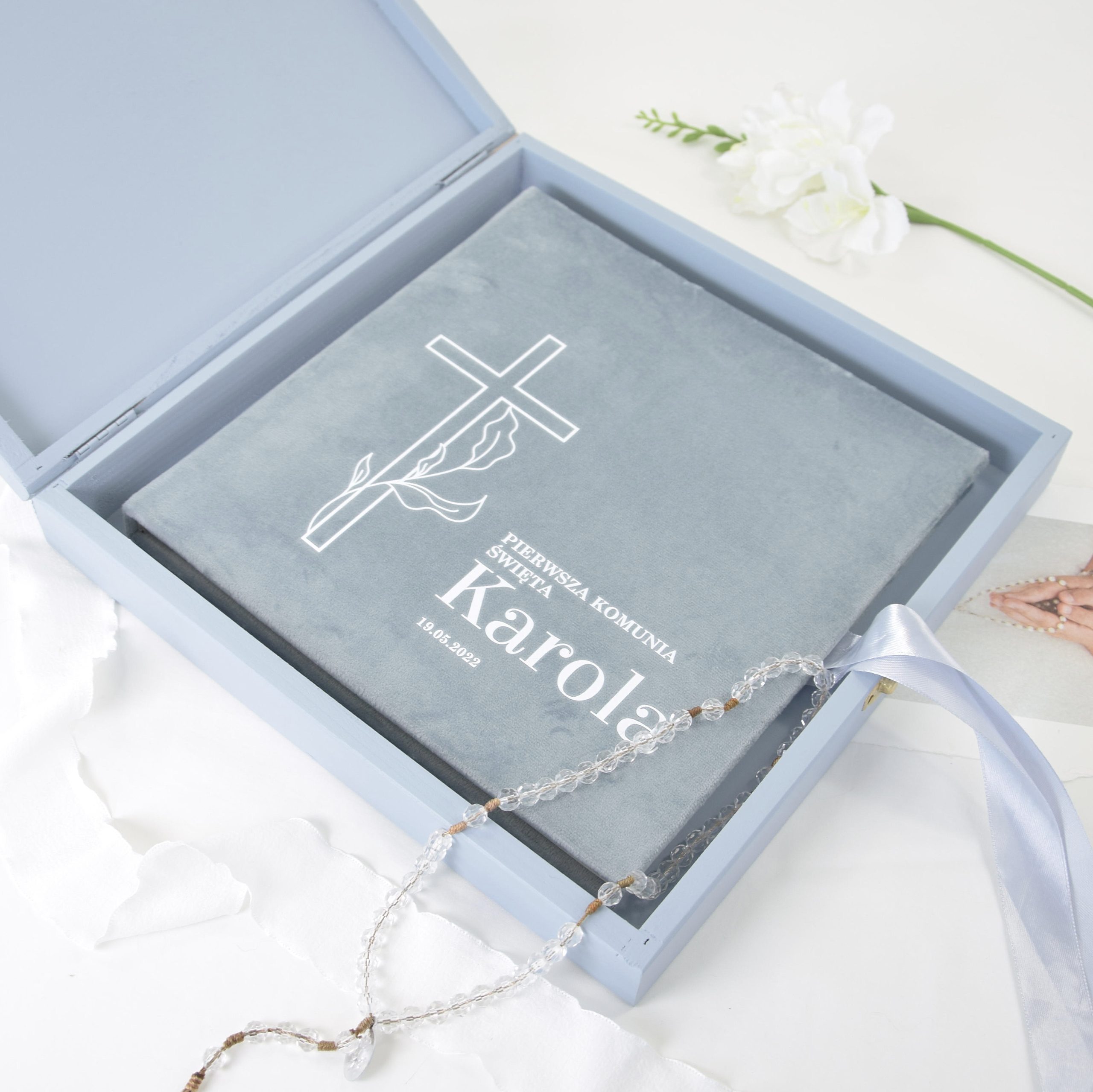 Taki zestaw komunijny świetnie sprawdzi się jako prezent od rodziców, dziadków lub chrzestnych. Drewniane pudełko dodaje mu klasy, a całość zyskuje charakter upominku przygotowanego z myślą o czymś naprawdę wyjątkowym. To pamiątka, do której wraca się z czułością, bo przechowuje nie tylko fotografie, lecz także ciepło rodzinnych chwil i wspomnienie ważnego kroku w życiu dziecka. Z czasem staje się domowym skarbem, który nabiera jeszcze większej wartości emocjonalnej.