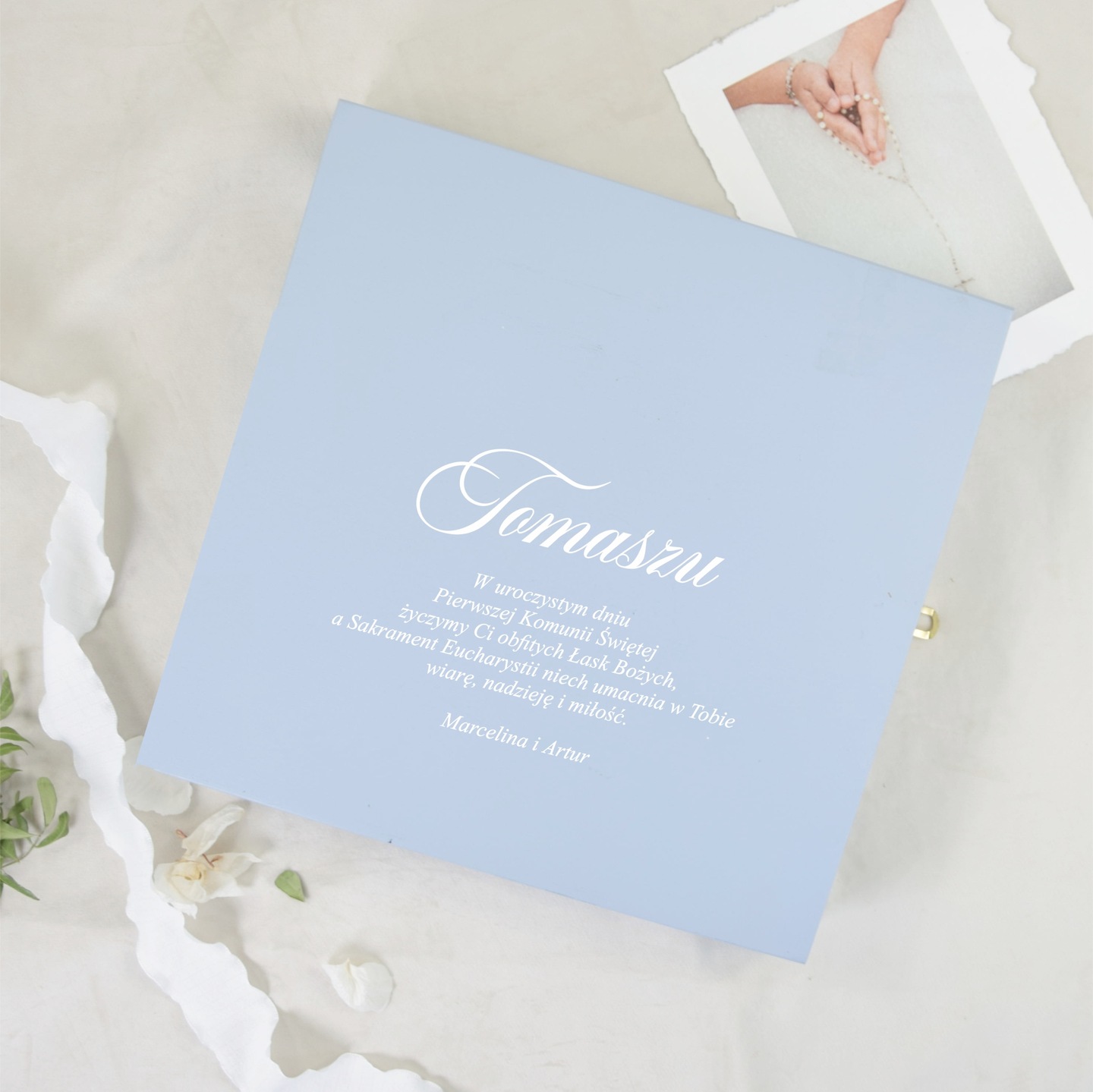 To wyjątkowy zestaw komunijny na prezent od rodziców, dziadków lub chrzestnych. Drewniane pudełko podkreśla jego elegancję, a sam album zyskuje wartość pamiątki, do której wraca się z sentymentem. Taki upominek przechowuje nie tylko zdjęcia, ale też ciepło, wzruszenie i wspomnienie kolejnego ważnego kroku w życiu dziecka. Z biegiem czasu staje się częścią rodzinnej opowieści, która nie traci swojego znaczenia.