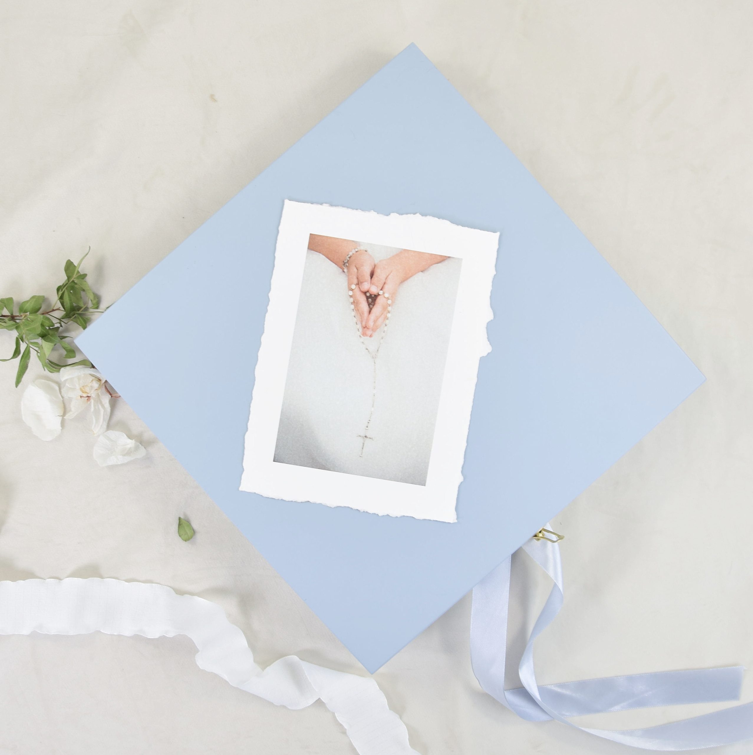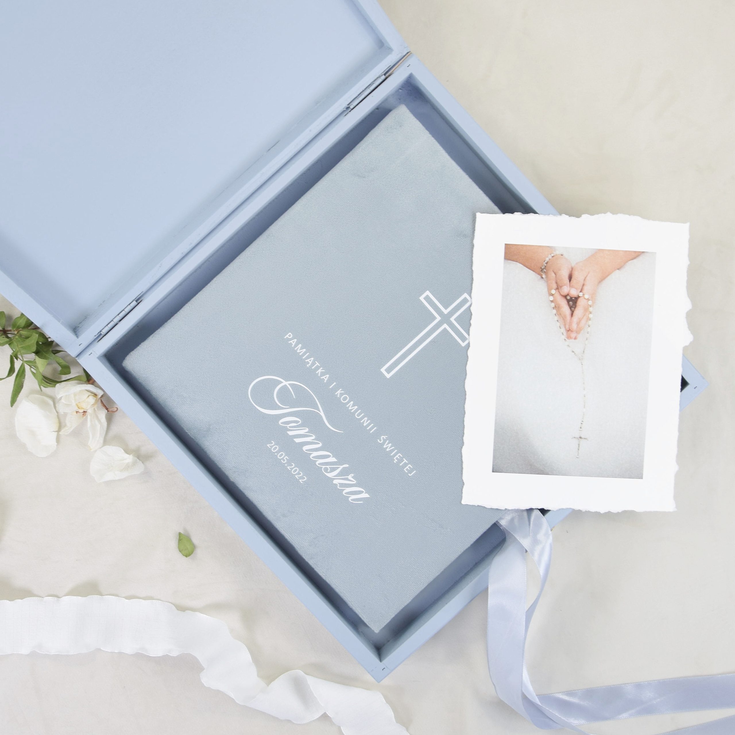 Album wewnątrz zestawu został wyposażony w sztywne karty, które stabilnie podtrzymują fotografie i pomagają zachować ich estetyczny układ. Pergamin oddzielający strony chroni zdjęcia przed otarciami i sklejeniem, a drewniane opakowanie zabezpiecza cały zestaw komunijny podczas przechowywania. Dzięki temu całość pozostaje nie tylko piękna, lecz także trwała i praktyczna. To ważne, bo pamiątki komunijne mają służyć przez wiele lat i wracać wraz ze wspomnieniami.