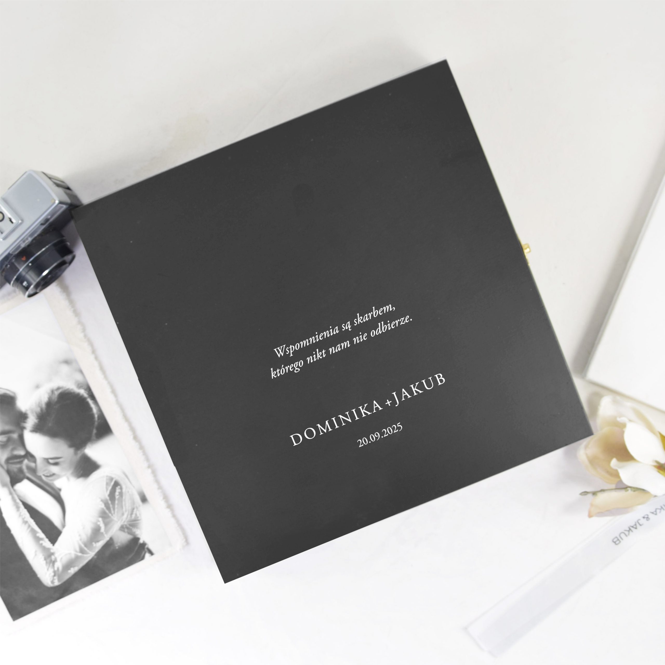 Drewniane opakowanie z grawerem pozwala przechować album w bezpieczny, elegancki sposób, dzięki czemu wspomnienia zyskują fizyczną formę, do której można wracać bez końca.